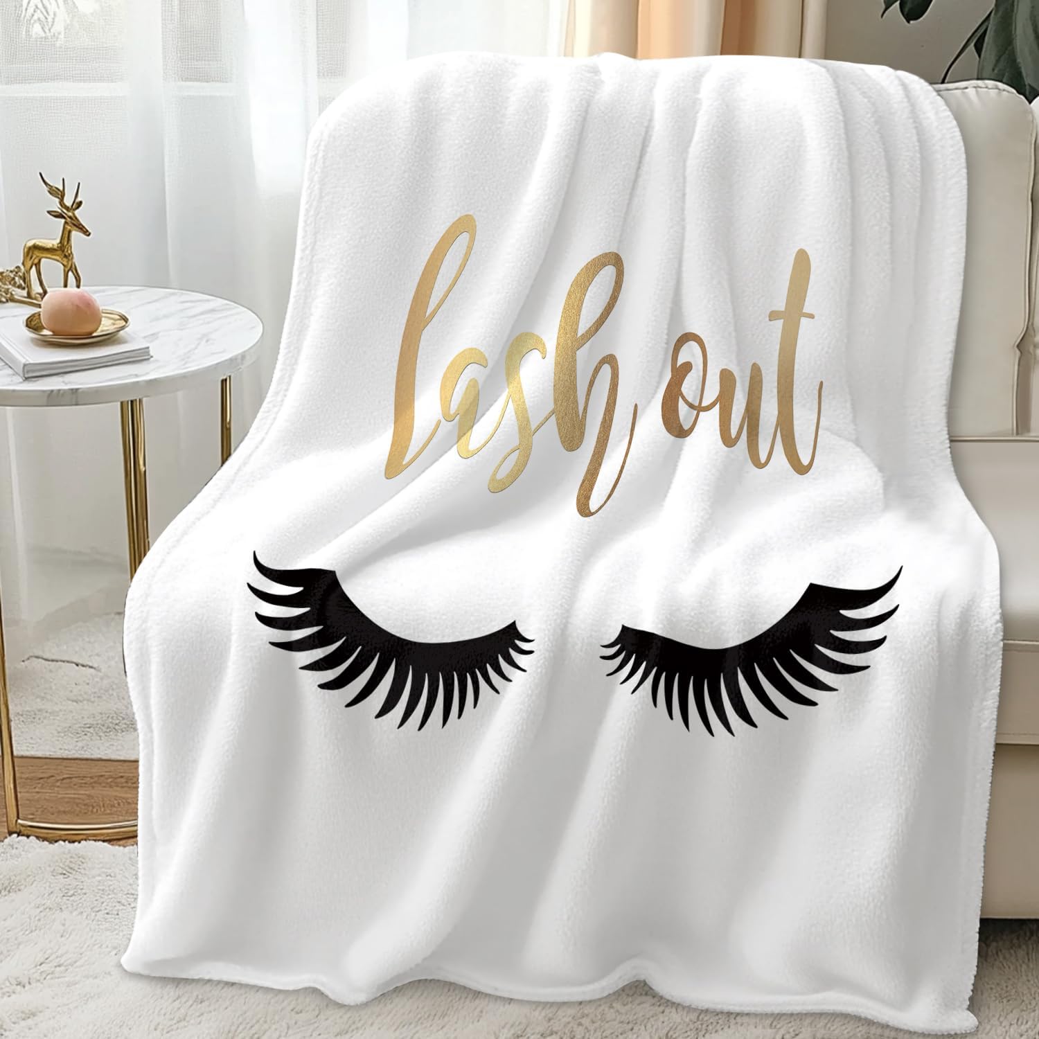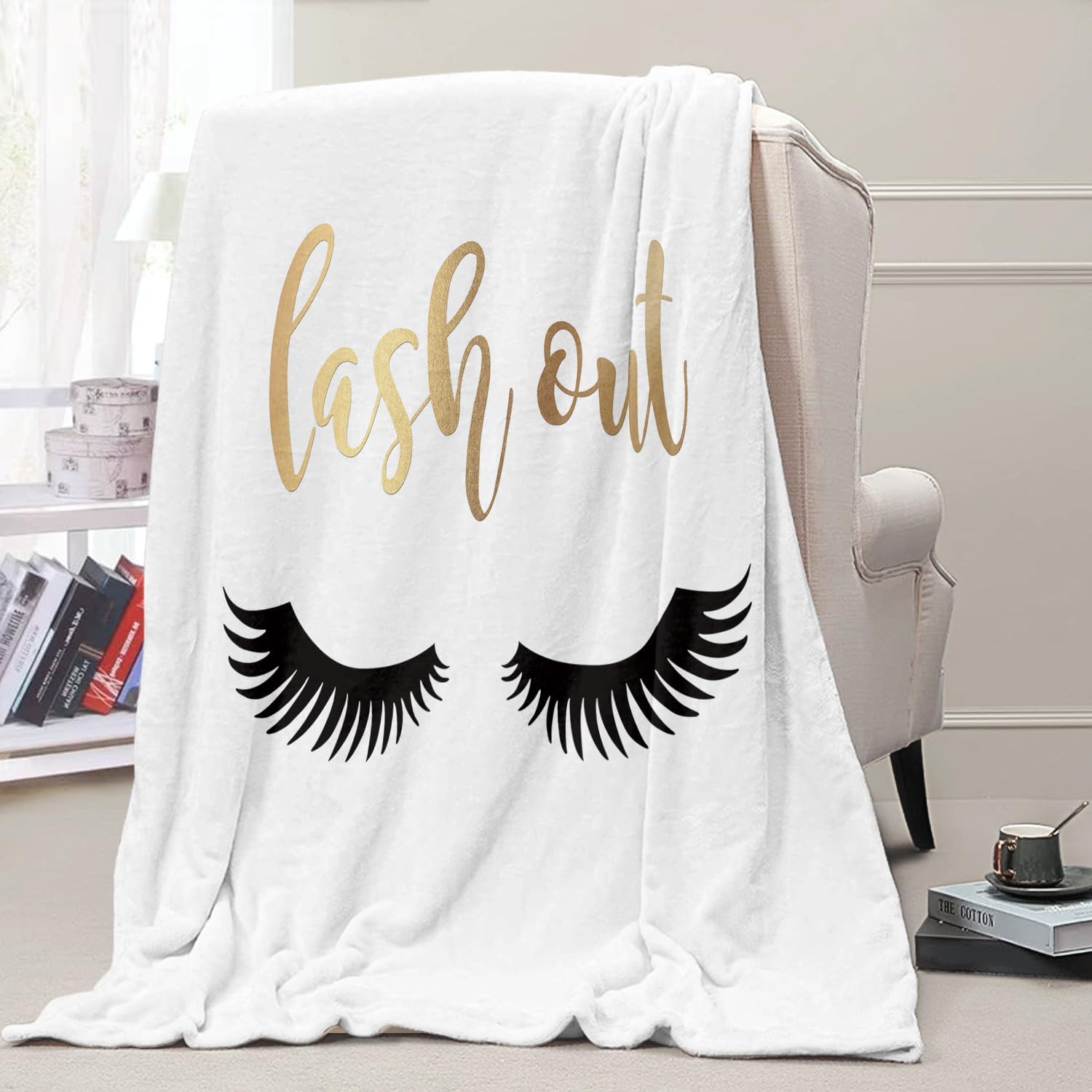 Dropshipful Long Eyelashes Flannel Fleece Blanket for Girls Women Lash Out Letter Print Blanket for Couch Bed Sofa Cozy Warm Home Decor White Blanket 50″x60″